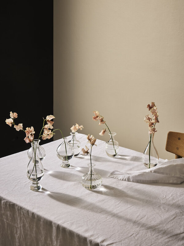 These small, transparent glass vases add a simple and elegant touch to any surface. Their timeless design makes them suitable for various settings, whether on a set table, by the window, or as part of a decorative arrangement.